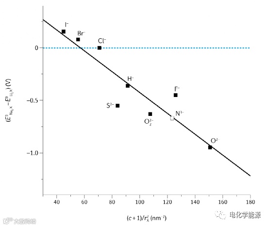 与类似的生成LiCx的反应相比,XC-−是一种普通的阴离子。为简单起见,我们假设NacX和LicX是线状化合物(其中化学计量比偏差足够小,以至于形成能很好地近似于标准值)。这两个转化反应的OCV之间的差异是由生成吉布斯自由能的差异决定的,生成自由能的差异又可以看作是二元化合物NaX(S)和LiX(S)的晶格能差与金属Na(S)和Li(S)的晶格能差(相对于气相中的自由离子和电子)之间的竞争。前者倾向于负电压差,而后者倾向于使电压差为正。晶格能量主要由离子大小决定,图2显示,对于含有大的单价阴离子(I-,Br-)的二元转化反应,钠化反应表现出比锂化反应更高的平台电压。这是因为反应产物NaCX和LiX的晶格能差太小,不能补偿金属Na和Li的晶格能差。相反,对于较小的(H-,F-)或多价阴离子(O2-,S2-,N3-),钠化的电压比锂化低。为了最大化电池中存储的能量,较低的电压在负极中是有利的,在正极中是不利的。