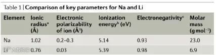钠和锂电池材料之间的许多重要区别可以通过几个决定性的电化学参数来理解:离子尺寸、极化率、电离能、电负性和摩尔质量(Table1)。钠离子比锂离子更大、更极化、更重,而且钠原子也比锂原子更容易电离和更具正电性。