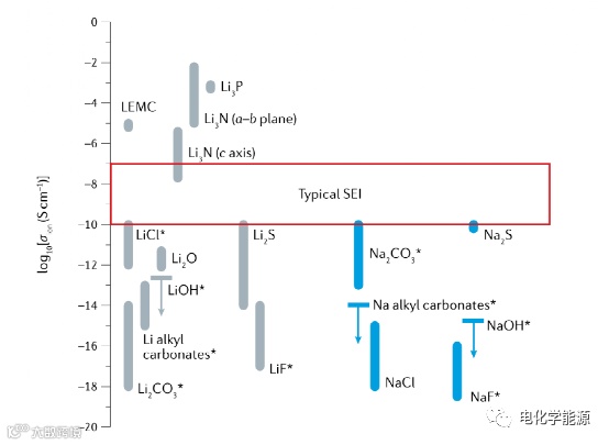 SEI组分的溶解性是另一个可能的问题,因为溶解会留下孔隙,液体电解质可以渗透到这些孔隙中,形成更多的SEI。在室温的水中,NaF、NaI、NaOH和Na2CO3比它们的Li类似物更易溶,而NaCl和NaBr的溶解度较低。