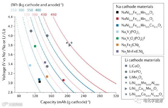 当从锂基材料转向钠基材料时,一些性能倾向于变差(阴极电压、单位质量或体积的阴极容量),一些变得更有利(转移电阻、阳极集电体),还有一些取决于特定的结构(电解质导电性、稳定性)。