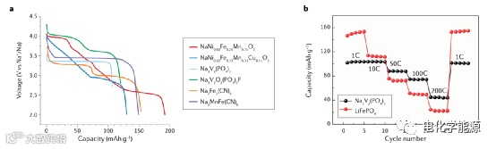 图3 阴极材料的性能。在低放电率(C/10)下测量各种正极材料的电压-容量曲线。60 nm Na3V2(PO4)3颗粒或100 nm LiFePO4颗粒电极在不同C速率下的容量。