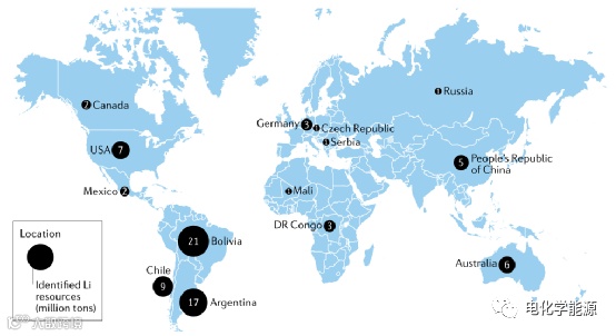 图1 锂资源:2019年底已探明的锂资源的全球分布。