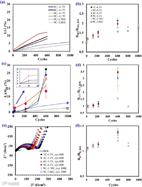【讨论】本图主要通过电化学表征分析在快充过程中正极的失效模型。锂离子的损失和SEI阻抗反应了电池的容量的失效,它们随着电池的循环大致呈现出线性增加趋势。但是对于活性材料的损失,在6C的倍率下,其在225次循环后呈现出快速衰减的趋势,并在400圈之后急速失效。这种变化趋势和RCT 的变化趋势大致相当。图2e的阻抗图表现出了,在600次循环的时候,高倍率和RCT相反的关系(即倍率约高,阻值越小)。此外,除了RSEI 和RCT,文章还分析了电解液体相电阻和不同充电倍率之间的关系。从图1和图2综合分析可以得出,即使在9 C的高充电倍率下,限制充电截止电压仍然可以降低锂离子和正极活性材料的损失。