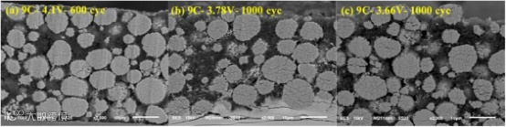 图4.采用9C充电倍率时,NMC532正极的低倍SEM截面图,在循环结束时的充电截止电压不同。在循环结束时,9 C、4.1 V;9 C、3.78 V和9 C、3.66 V的总容量分别为10.6、11.5和6.9 Ah。