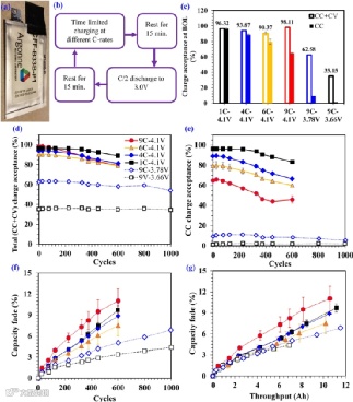 图 1. 单片软包电池(SLPC) 的循环细节,循环初期的电池性能和老化行为。(a) SLPC 的光学照片,(b) 1000 次循环电池的充放电协议,(c) 循环初始阶段第一次循环的充电效率,(d) 总充电效率随循环的演变,(e) 恒流充电模式下,充电效率随循环的演变, (f) C/20条件下,容量衰减与循环次数的关系 (g) C/20 容量衰减与累积充电容量的关系。