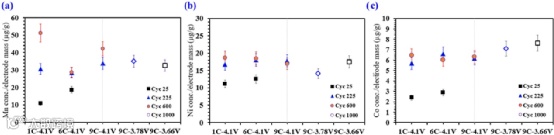 图5. ICP-MS法测定了不同充电和循环条件下过渡金属的溶出量。(a) Mn的溶出,(b) Ni的溶出,(c) Co的溶出。