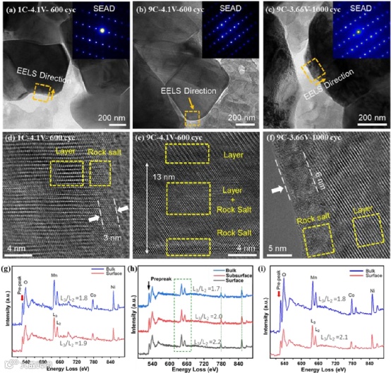 图6. TEM对正极颗粒表面原子结构变化的表征。(a) 1C, 4.1 V, 600循环,(b) 9 C, 4.1 V, 600循环,和(c) 9 C, 3.66 V, 1000循环后的TEM图像。(d) 1 C, 600循环, 4.1 V, (e) 9C, 600循环, 4.1 V, (f) 9 C, 1000循环, 3.66 V条件下正极结构的HR-TEM(高分辨)图像。颗粒上两个不同位置的EELS能谱:(g) 1C, 600循环, 4.1 V, (h) 9C, 600循环, 4.1 V,和 (i) 9C, 1000循环, 3.66 V。
