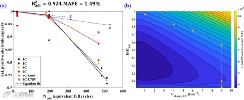 图7. (a) 正极损失模型预测。预测值为拟合的直线,数据点为从循环后回收的Li/NMC软包电池中的原始数据,(b) c2值和DOCCC和Ccharge,CC的关系图。其中,c2值越高,正极损失率越高。