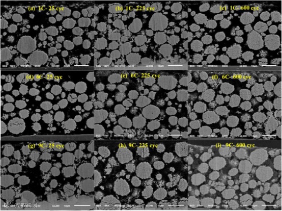 图3. 在1,6和9 C充电倍率下,在25,225和600次循环后, NMC532正极的低倍SEM图像。其中,集流体位于底部,隔膜位于顶部。
