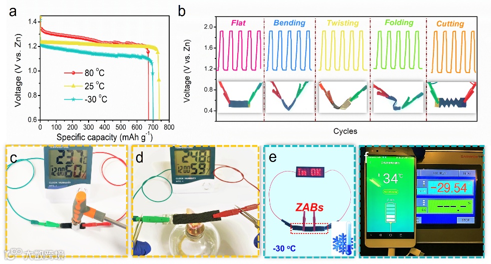 此外,该柔性电池在各种外界刺激和干扰(如各类机械形变,剪切,冲击及火烧)下均能表现出稳定的充放电性能,满足了柔性储能器件对卓越安全性的需求。即使在-30oC下,该柔性锌空电池组也可以驱动LED 显示频,并为智能手机充电。