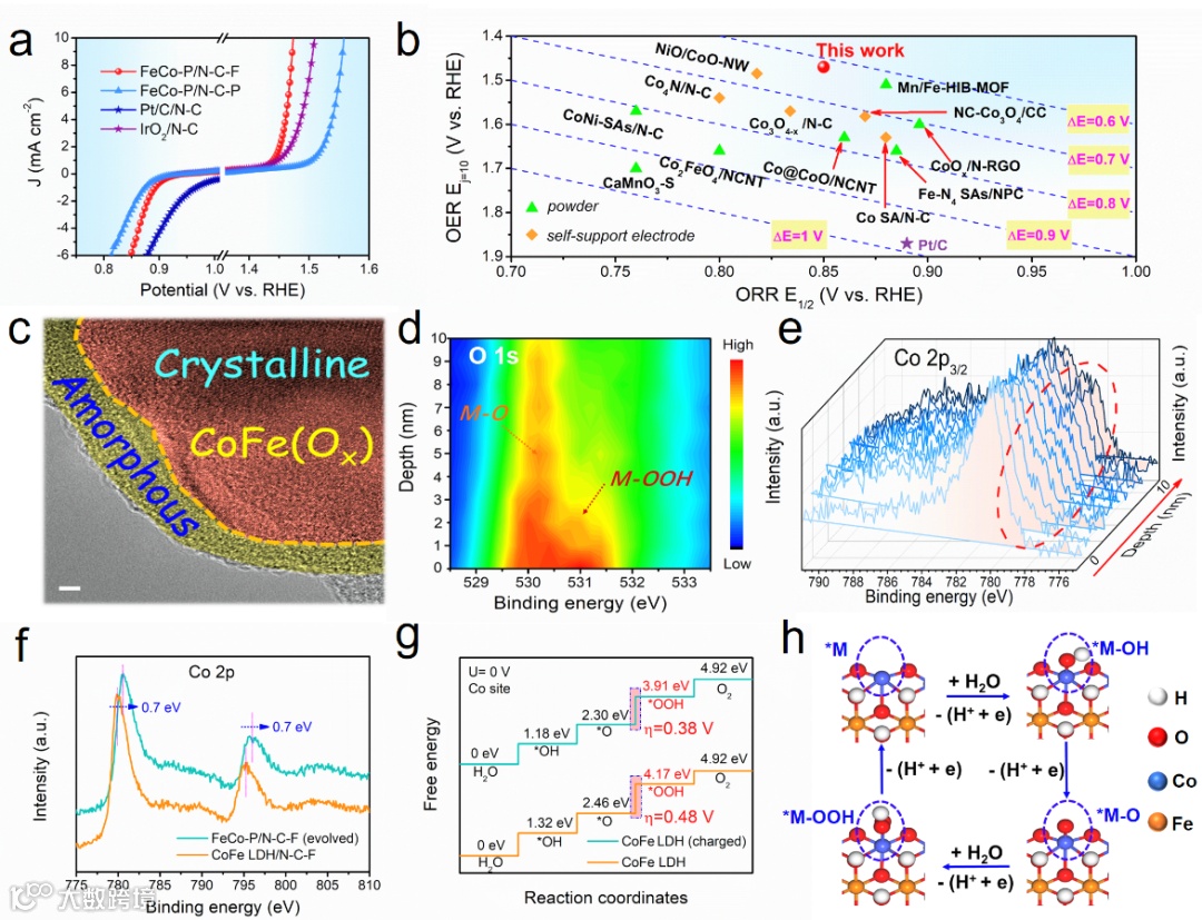 进一步,作者指出电极中的金属位点在氧化电压下发生了原位重构:最外层的金属磷化物演化成约数纳米厚无定形的CoFeOOH,而近表层为晶型内核的尖晶石型CoFe2O4,最内层晶核仍为CoFe合金(即CoFe(Ox)@CoFeOOH结构);由于外层无定形CoFeOOH薄层对晶型内核的保护作用,该核壳结构的金属位点在循环性实验之后仍稳定存在。系列对比实验及理论计算证实,由于CoFe2O4为p型半导体而CoFeOOH表现出类n型半导体性质,两者在界面处形成内建电场,导致外层CoFeOOH因为“电荷耗尽”效应而表现出比一般的CoFe-LDH更佳的OER性能。
