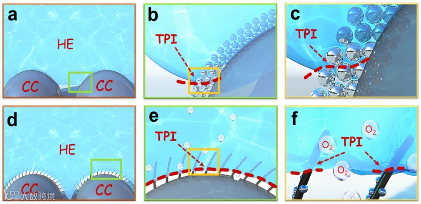针对上述问题,现有研究主要集中于开发高效电催化剂和改性聚电解液两方面,并皆已取得长足进步;作者团队此前也曾报道了第一款具有低温适应性能的柔性锌空电池(Angew. Chem. Int. Ed. 2020, 59,4793)。然而,空气电极中的电催化反应发生于固液气三相活性界面,且在柔性器件中电极-电解液的界面接触远不如相应的充分浸润的液态电解液器件,从而导致大部分电极的活性电催化位点不能实际贡献于锌空电池的性能。