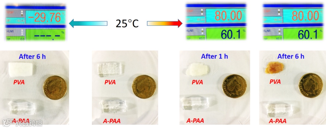 图4.典型的碱化聚丙烯酸(A-PAA)与聚乙烯醇(PVA)电解质的温度适应性对比。