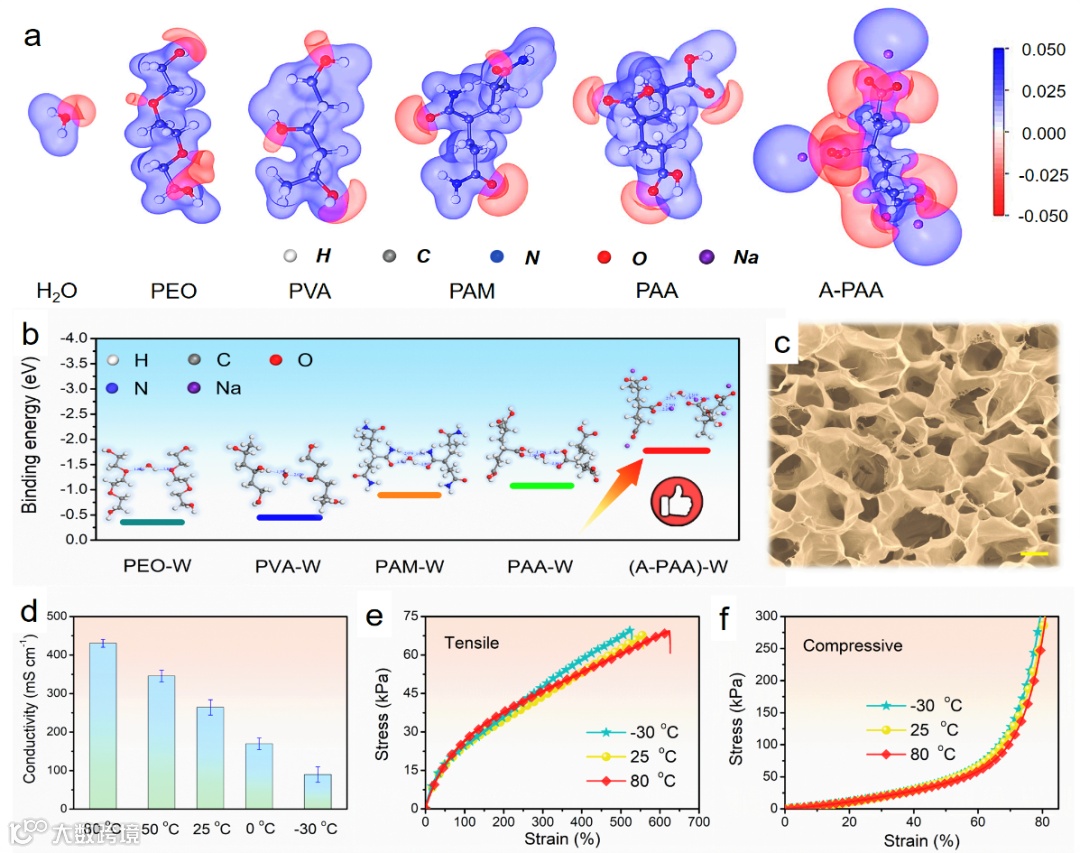 以碱化聚丙烯酸(A-PAA)为例,该类聚电解质可以在-30- 80 oC的温度区间内保持良好的电化学性能与机械柔性,满足绝大多数人类活动中柔性设备所面临的使用环境温度。