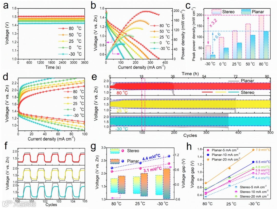 基于碱浸渍的A-PAA聚电解质,作者将立体电极和平面电极组装成柔性锌空电池(分别为ZAB-Stereo和ZAB-Planar),测试了其在不同温度下的电化学性能。有趣的是,当温度从80oC下降至-30oC时,ZAB-Planar的峰值功率密度下降了约6.6倍,而ZAB-Stereo仅下降了3.2倍。