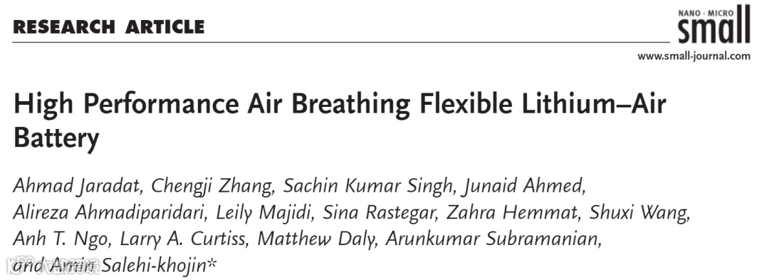 基于此,伊利诺伊大学芝加哥分校的Amin Salehi-khojin 教授在国际知名期刊 Small 上发表题为“High Performance Air Breathing Flexible Lithium–Air Battery” 的论文。