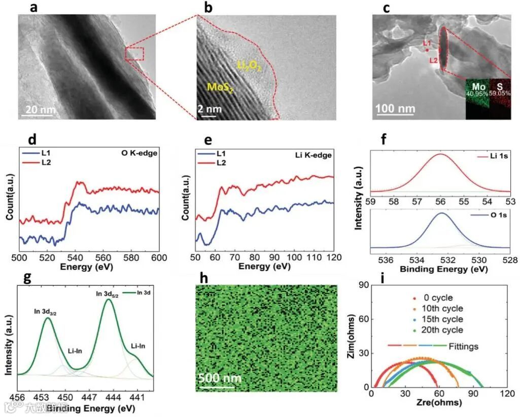 Li-O2电池在环境空气中的元素分布和化学成分表征。a,b) 放电阴极的低分辨率和高分辨率 TEM 图像,显示了沉积在 MoS2阴极上的Li2O2 c) 第 10 次放电后阴极表面的 STEM 图像。d,e) Li2O2的EELS 光谱在第 10 次放电后的阴极表面d) O-K 边缘和 e) Li-K 边缘。f) 第 10 次放电后阴极的 XPS。g) 在环境空气中第 10 次循环后锂负极上 In 3d 区域的 XPS。h) 铟元素阳极的俯视SEM-EDX成分图。i) 未循环和循环后阳极表面的 EIS 测量和拟合数据。点代表实验数据,线代表拟合数据。