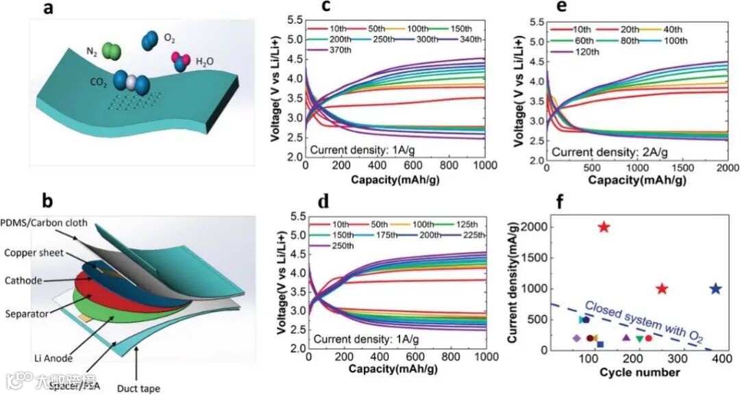 柔性Li-O2电池在氧气和干燥空气中的示意图和电化学性能。a) 柔性 Li-O2电池示意图。b) 电池的多层结构。c) 氧气室中的放电/充电曲线。d,e) 干气室中不同电流密度和容量下的放电/充电曲线。f) 电池在氧气(蓝星)和干燥空气(红星)和其他(仅适用于 O2)中的电流密度与循环次数的比较。