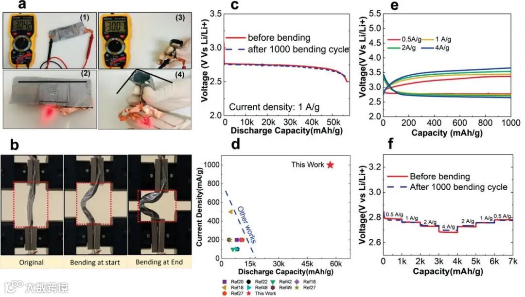 在环境空气中Li-O2电池的弯曲柔性测试。a) 柔性电池在不同弯曲条件下的开路电压测量和LED照明效果;(1,2) 扁平(0°弯曲)和 (3,4) 弯曲电池。b) Li-O2电池在环境空气中弯曲实验(疲劳测试)。c) 弯曲试验前后柔性电池在环境空气中的深度放电。d) 我们的电池在环境空气中的放电容量和电流密度与基于 2.5 V 截止电压的其他参考的比较。e) 在环境空气中不同电流密度下的充电/放电曲线。f) 弯曲试验前后的额定能力结果。