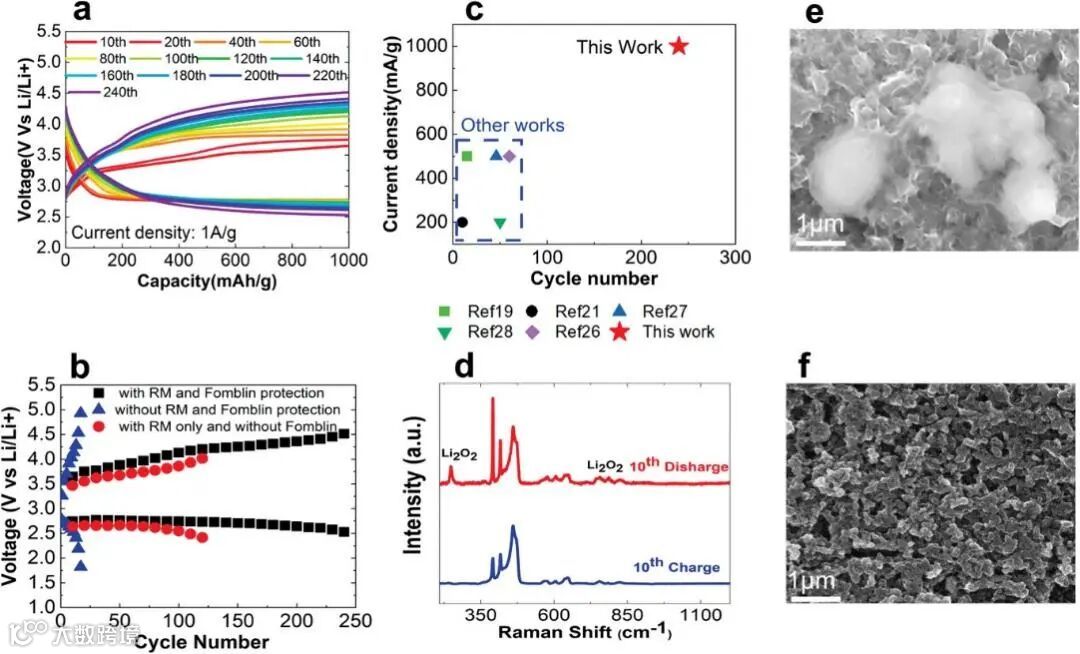 只使用了 RM不使用 Fomblin的电池,第 110 次循环后放电电位下降到 2.5 V,充电电位增加到 3.93 V,电池在 120 次循环后失效。在同时使用Fomblin保护层和 RM 的情况下,电池最多可运行 240 次循环。进一步证实了利用 RM 和保护层的有效性。