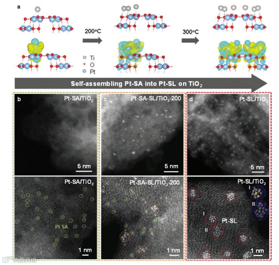 本文章报道了Pt单原子层催化剂,并且利用ex-situ的STEM, XAS等手段观察了其形成过程的原子结构演变。运用精准的温度调控,配合TiO2纳米片载体的优势,记录单原子通过自组装的方式形成了Pt单原子层催化剂。