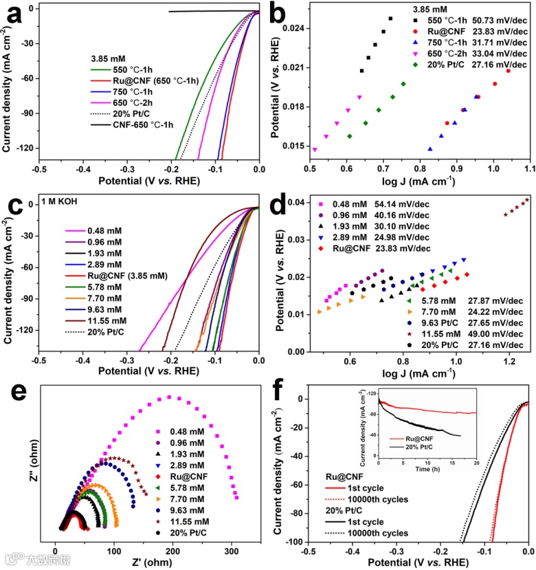 图3. 不同温度、不同前驱体浓度制备的系列Ru@CNF催化剂于 1 M KOH电解液中的HER极化曲线、Tafel斜率、阻抗谱和稳定性测试曲线。