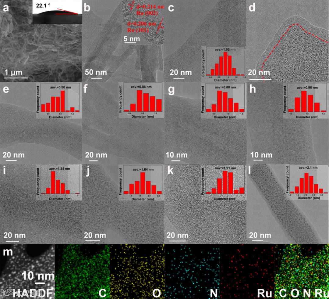 图1. (a-d)Ru@CNF的SEM、接触角、TEM以及晶格图;(e-l)不同浓度钌联吡啶前驱体制备出的一系列不同粒径催化剂TEM图;(m)Ru@CNF的mapping图。