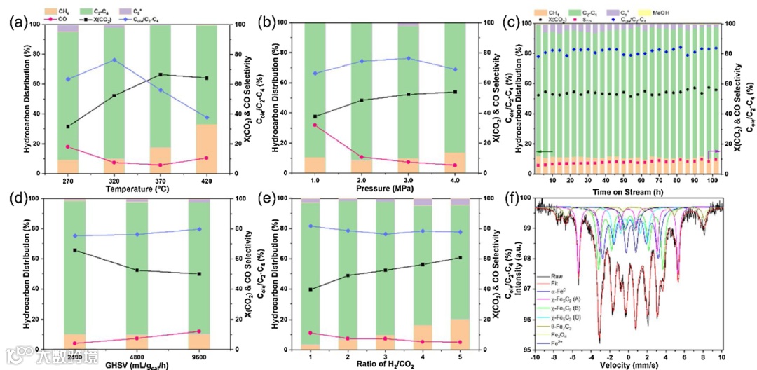 图6. (a–b, d–e) 反应条件对催化活性的影响。(c) 催化剂的活性稳定性评价。(f) 0.8Fe-0.1K@N-OMC-100h的穆斯堡尔谱图。
