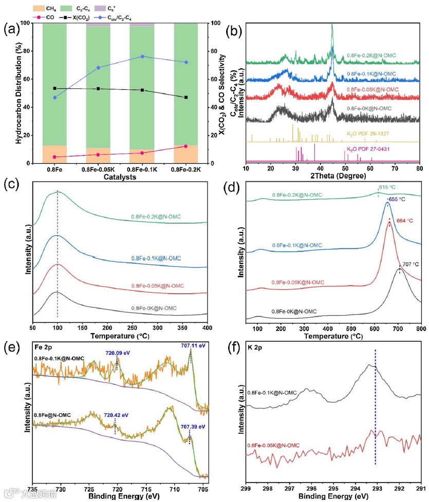图5. (a) 0.8Fe-yK@N-OMC的催化活性。(b) 0.8Fe-yK@N-OMC的XRD图。(c–d) 0.8Fe-yK@N-OMC的CO2-TPD和H2-TPD图。(e) 0.8Fe@N-OMC和0.8Fe-0.1K@N-OMC的Fe2p XPS图。(f) 0.8Fe-0.05K@N-OMC和0.8Fe-0.1K@N-OMC的K2p XPS图。