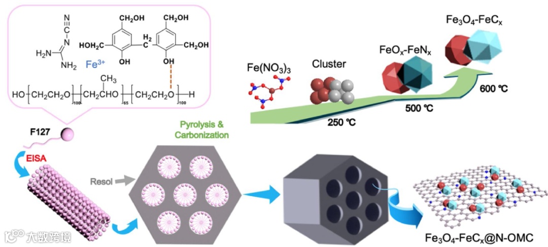 图1. Fe3O4-FeCx@N-OMC的合成过程与原理。