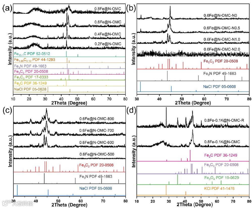 图2. (a) 0.2–0.8Fe@N-OMC的XRD图。(b) 不同N掺杂量的0.6Fe@N-OMC的XRD图。(c) 不同热解温度的0.6Fe@N-OMC XRD图。(d) 0.8Fe-0.1K@N-OMC和 0.8Fe-0.1K@N-OMC-R的XRD图。