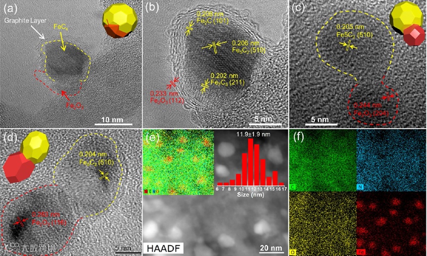 图3. (a-d) 0.8Fe@N-OMC的HR-TEM图。(e-f) 0.8Fe@N-OMC的HAADF-STEM图和粒径分布图。
