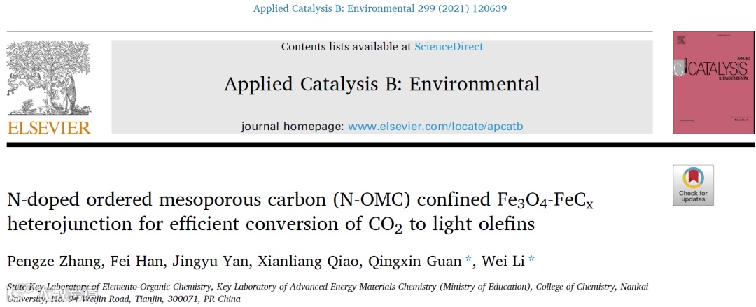 本文中,来自南开大学的李伟教授与关庆鑫副教授,在国际知名期刊Applied Catalysis B: Environmental上发表题为“N-doped ordered mesoporous carbon (N-OMC) confined Fe3O4-FeCx heterojunction for efficient conversion of CO2 to light olefins”的研究文章。