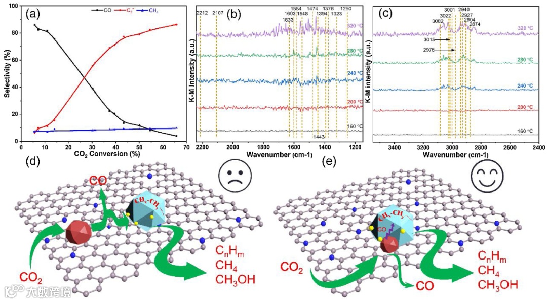 图7. (a) CO2转化率与产物选择性的关系图。(b-c) 0.8Fe-0.1K@N-OMC的原位DRIFTs图。(d) 0.8Fe-0.1K/N-OMC和0.8Fe-0.1K@N-OMC反应机理图。