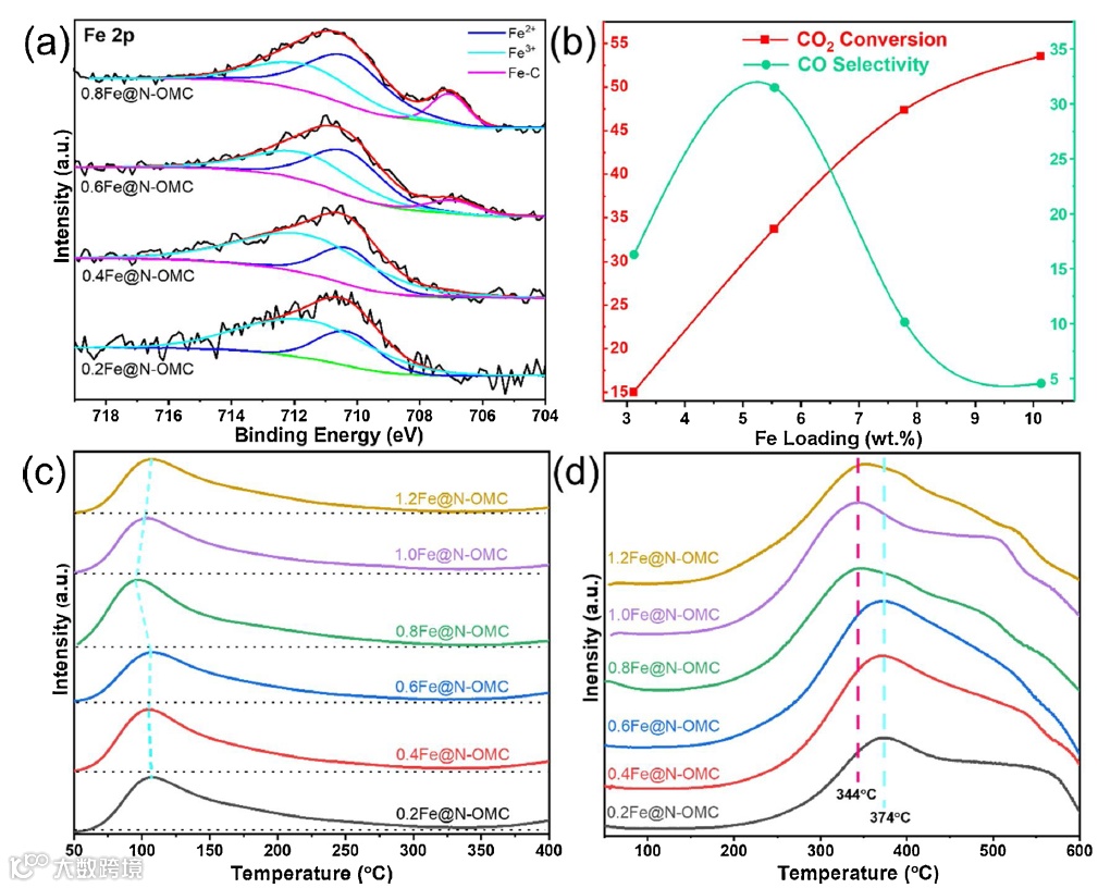 图4. (a) 0.2–0.8Fe@N-OMC的Fe2p XPS图。(b) 不同Fe负载量的催化剂的CO2转化率与CO选择性的关系图。(c) 0.2-1.2Fe@N-OMC的CO2-TPD。(d) 0.2-1.2Fe@N-OMC的H2-TPR。
