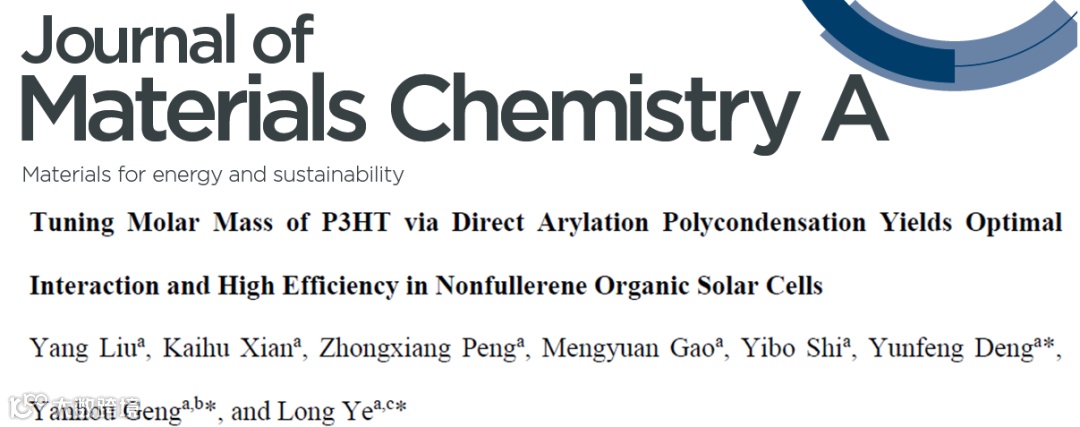 近日,天津大学的叶龙教授、邓云峰副教授、耿延候教授等人在国际知名期刊Journal of Materials Chemistry A上发表题为“Tuning Molar Mass of P3HT via Direct Arylation Polycondensation Yields Optimal Interaction and High Efficiency in Nonfullerene Organic Solar Cells”的研究论文。