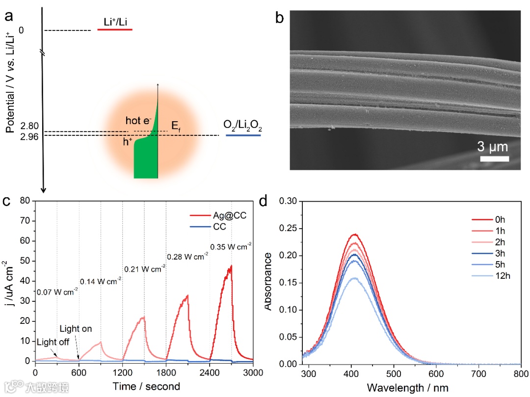 图1. (a)热e-、h+、O2/Li2O2与Li/Li+的能量图。(b) Ag@CC的SEM图像。(c) Ag@CC和CC在415 nm光照下不同入射光强下的i-t曲线。(d)在415nm光照下对人工电极上的Li2O2进行紫外可见光谱测试。