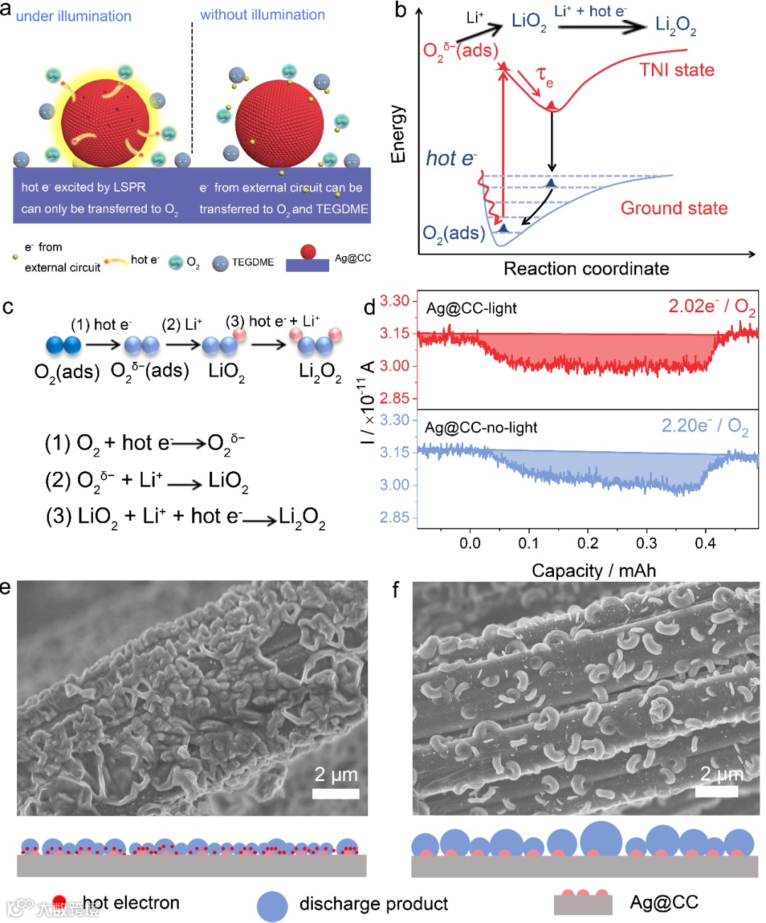 图4. (a)光照下/非光照下Ag@CC对电子转移的选择性示意图。(b) Ag NPs表面热电子诱导生成Li2O2的机理。(c)放电过程中的反应。(d)原位DEMS。(e-f) 光照下/非光照下放电后的Ag@CC正极的SEM图像。
