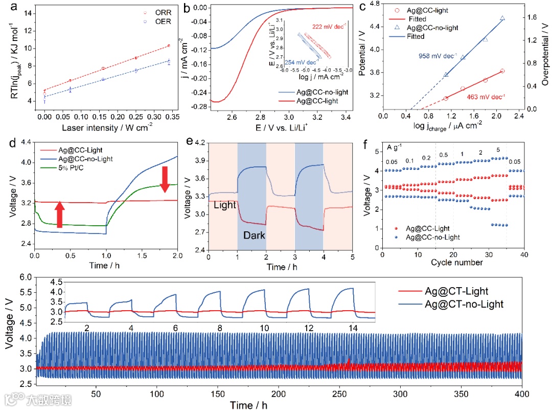 图5.反应动力学和基于Ag@CC正极的Li–O2 电池性能。a)415 nm光照下,RTln(jpeak)-激发光强度图。b)5 mV s-1扫描速度下的ORR反应的线性伏安扫描曲线和Tafel图。c)恒流充电电压归一化电流的Tafel图。d)100 mA g-1电流密度下,基于Ag@CC/ 5%Pt/C 正极的Li–O2 电池充放电曲线。e)间断光照下Li–O2 电池的光响应图。f)不同电流密度下光照下/非光照下基于Ag@CC正极的Li–O2 电池的倍率性能。g)Li–O2 电池的循环性能。