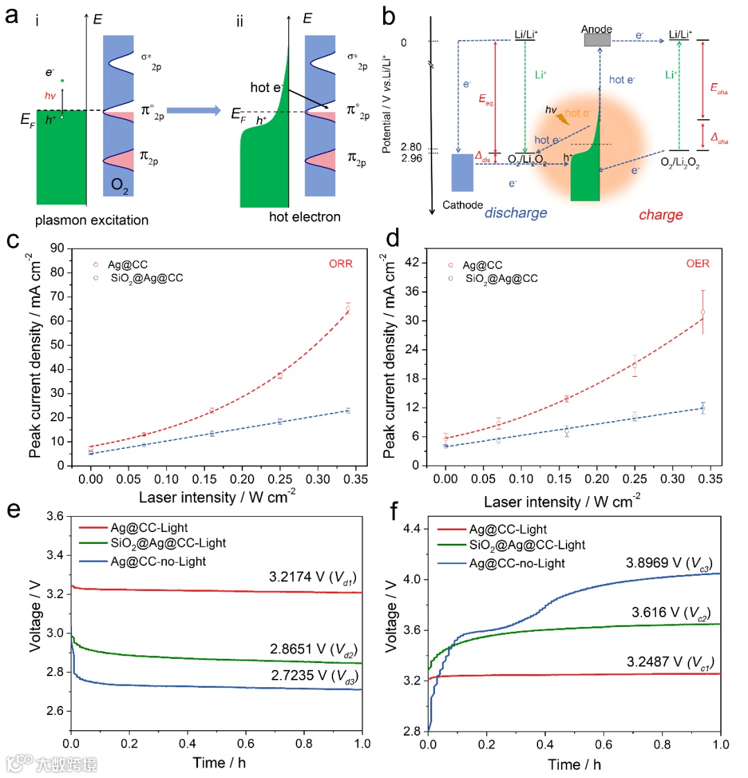 图3. (a) Ag NPs等离子体诱导的热电子产生原理图。(b)光照下Li-O2电池放电过程和充电过程的能量示意图。(c-d)在415nm光照下,LSV的峰值电流密度与入射光强度的函数。(e-f)在电流密度为100 mA g-1时,光照/非光照下Ag@CC和光照下SiO2@Ag@CC的放电曲线和充电曲线。