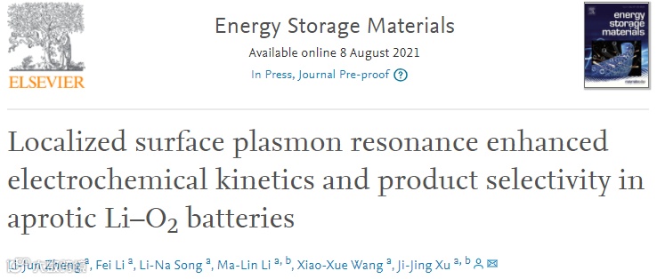 Li-Jun Zheng, FeiLi,Li-Na Song, Ma-Lin Li, Xiao-Xue Wang, Ji-Jing Xu. Localized surface plasmon resonance enhanced electrochemical kinetics and product selectivity in aprotic Li–O2 batteries. Energy Storage Materials, doi:10.1016/j.ensm.2021.08.004.