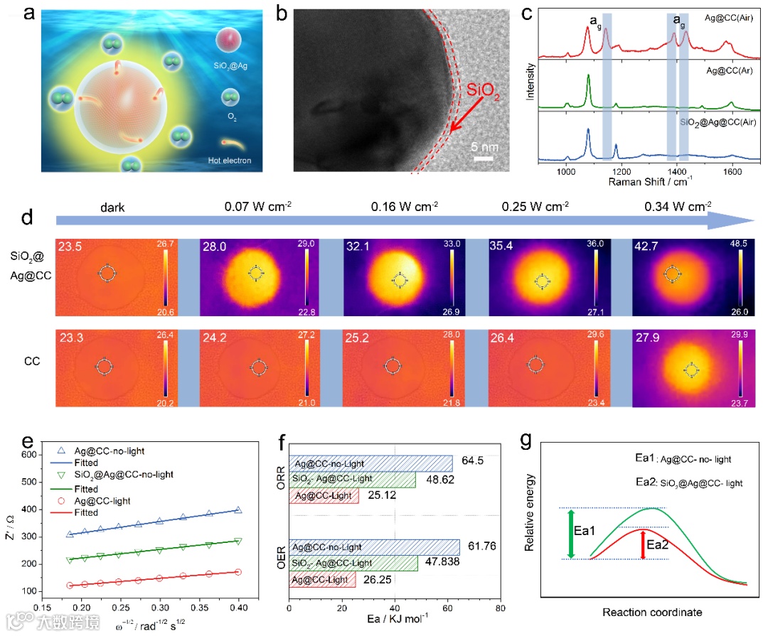 图2.(a)等离子体热效应的工作机制。(b) SiO2@Ag@CC的TEM图像。(c) Ag@CC在Ar气和大气中的拉曼光谱,SiO2@Ag@CC在大气中的拉曼光谱。(d) SiO2@Ag@CC, CC在415 nm不同入射光强度下的红外热像仪图像。(e) 光照/非光照下Ag@CC和光照下的SiO2@Ag@CC的法拉第阻抗谱。(f) 光照/非光照下Ag@CC和光照下SiO2@Ag@CC的活化能。(g)等离子体热效应的详细工作机理。