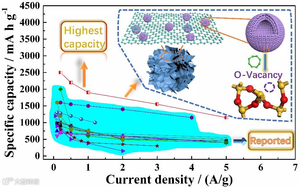 于密度泛函理论(DFT)和实验分析,丰富的氧空位不仅能有效地增加Li+储存活性位点、降低Li+扩散能垒,而且有利于提高电导率和降低体积膨胀。
