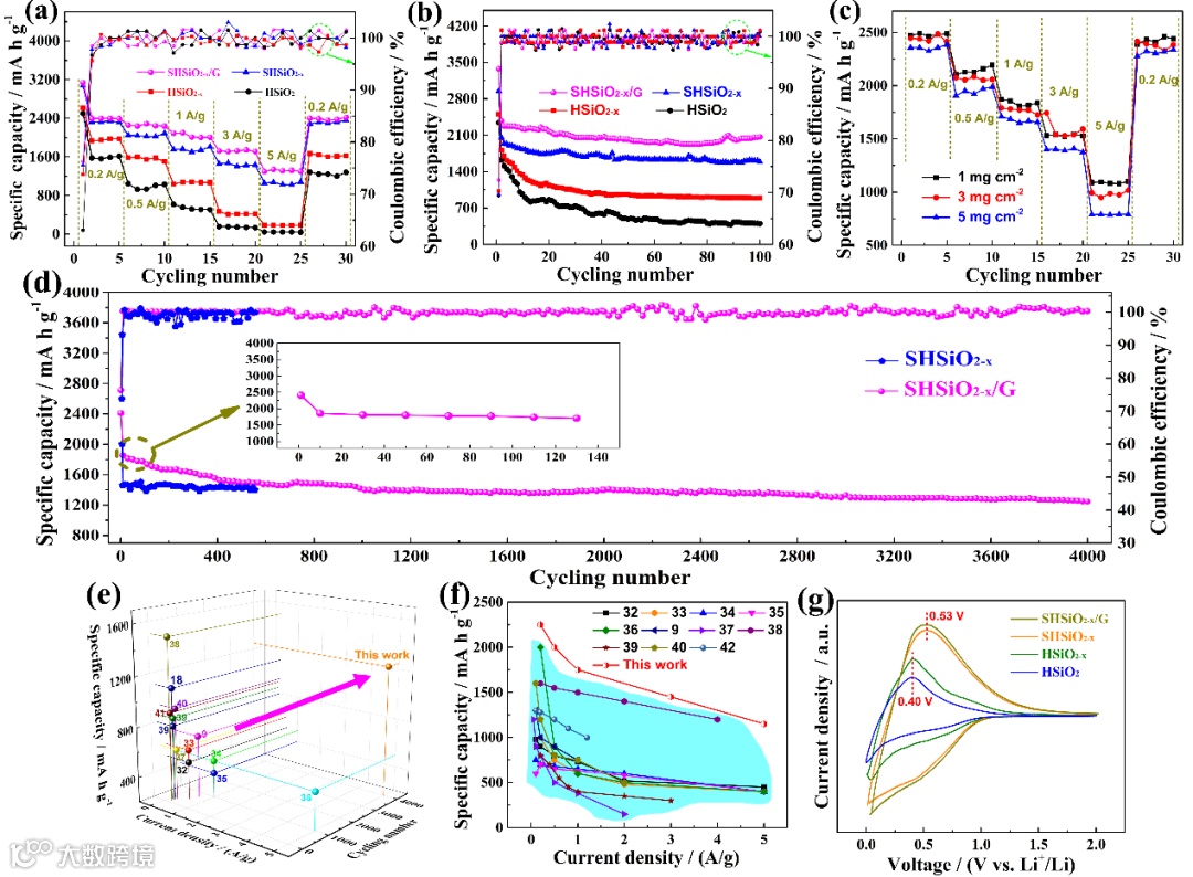 Figure 3. (a) Rate-performance of the four electrodes at various current densities. (b) Cycling performance of the four electrodes at 0.5 A/g. (c) Rate-performance of the SHSiO2-x/G with different loading mass. (d) Long-term cycling performance of SHSiO2-x/G and SHSiO2-x at 3 A/g. Comparison of (e) cycling and (f) rate performance among typical reported silicon oxides anodes. (g) CV curves of the four electrodes at a scan rate of 0.2 mV/s.