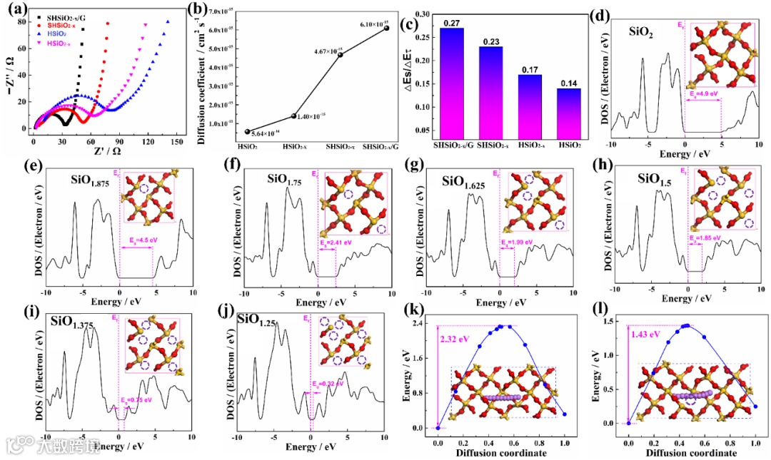 Figure 4. (a) EIS plots and corresponding (b) Li+ diffusion coefficient of the four electrodes. (c) Values of △Es/△Eτ for the four electrodes. DOS profiles for SiO2 with various oxygen vacancies concentrations ((d) SiO2, (e) SiO1.875, (f) SiO1.75, (g) SiO1.625, (h) SiO1.5, (i) SiO1.375 and (j) SiO1.25) (the circles in models denote the oxygen vacancies). A possible Li+ diffusion path and corresponding energy barrier in the (k) SiO2 and (l) V-SiO2.
