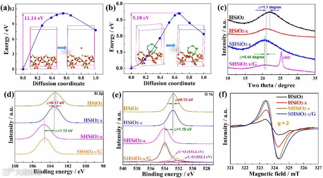 Figure 1. Energy evolution profiles for formation of oxygen vacancy (a) without and (b) with addition of sulfur (S8). (c) XRD patterns, (d) XPS Si 2p, (e) XPS O 1s and (f) EPR spectra of the HSiO2, HSiO2-x, SHSiO2-x and SHSiO2-x/G.