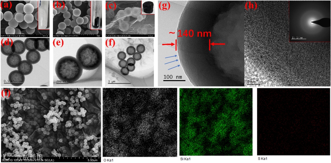 Figure 2. SEM morphology and optical photos (insets) of the (a) HSiO2-x, (b) SHSiO2-x and (c) SHSiO2-x/G. TEM morphology of (d) HSiO2-x, (e) SHSiO2-x and (f) SHSiO2-x/G. (g) and (h) are the enlarged TEM morphology of SHSiO2-x/G (inset is the associated FFT image). (i) EDS elemental mapping images of O, Si and S in the SHSiO2-x/G.