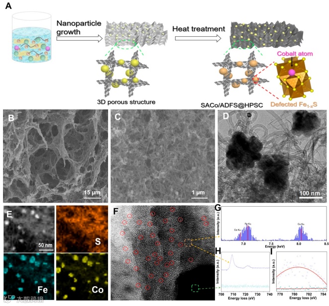图1 阳离子缺陷硫化亚铁锚定高活性钴单原子(SACo/ADFS@HPSC)的合成示意图和形貌特征