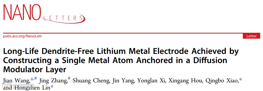 Jian Wang, Jing Zhang, Shuang Cheng, Jin Yang, Yonglan Xi, Xingang Hou, Qingbo Xiao, Hongzhen Lin,Long-Life Dendrite-Free Lithium Metal Electrode Achieved by Constructing a Single Metal Atom Anchored in a Diffusion Modulator Layer 2021, DOI: 10.1021/acs.nanolett.1c00534
