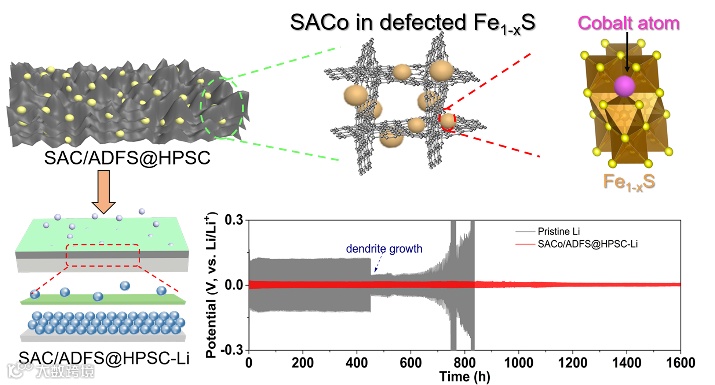 首次提出利用缺陷位点的方式来锚定金属单原子的方法,将高活性金属单原子锚定在阳离子缺陷化合物中作为锂离子动力学调控层(SACo/ADFS@HPSC),实现对锂离子动力学的催化,丰富的SACo活性位点可引导锂以较低的能垒均匀成核,并加快在水平方向的锂沉积动力学,促进锂金属表面的无枝晶化过程。